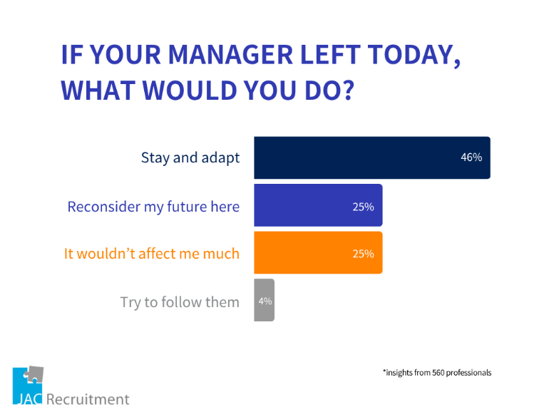 「再考する」と答えた25%と、「ついていく」と答えた4%を合わせると、全体の29%が退職の可能性を視野に入れていることになります。つまり、約3人に1人が職場を離れるかもしれないということです。