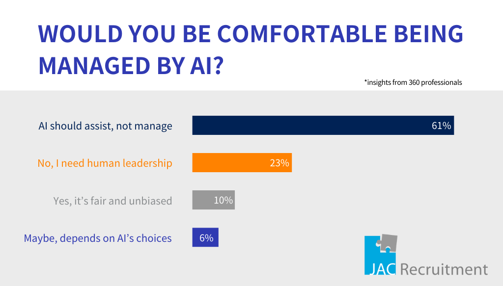 「人間のリーダーが必要」と答えた23%の回答者は、共感や経験の共有、微妙なニュアンスの理解といった感情的なつながりを重視しています。特にキャリア支援や採用といった人間中心の業務では、信頼を生むのはやはり「人」であるという意識が根強くあります。